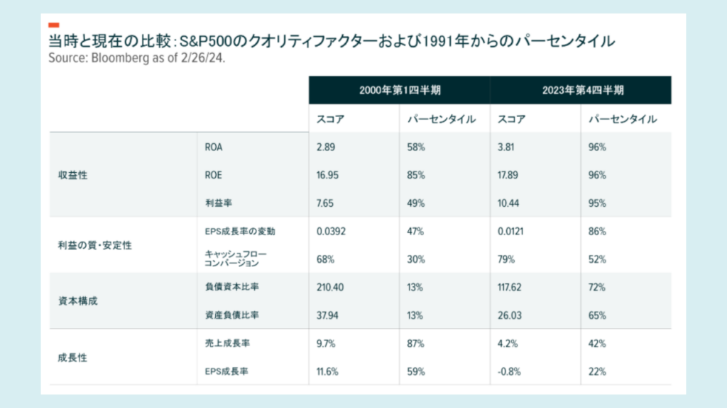 これはドットコムバブル期の2000年と直近2023年のS&P500の収益性や安定性を比較したグラフです