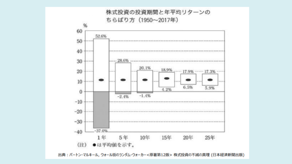 このグラフは、1950~2017年の約70年間で、投資期間とその年平均リターンと、その散らばり方の関係を示したものです