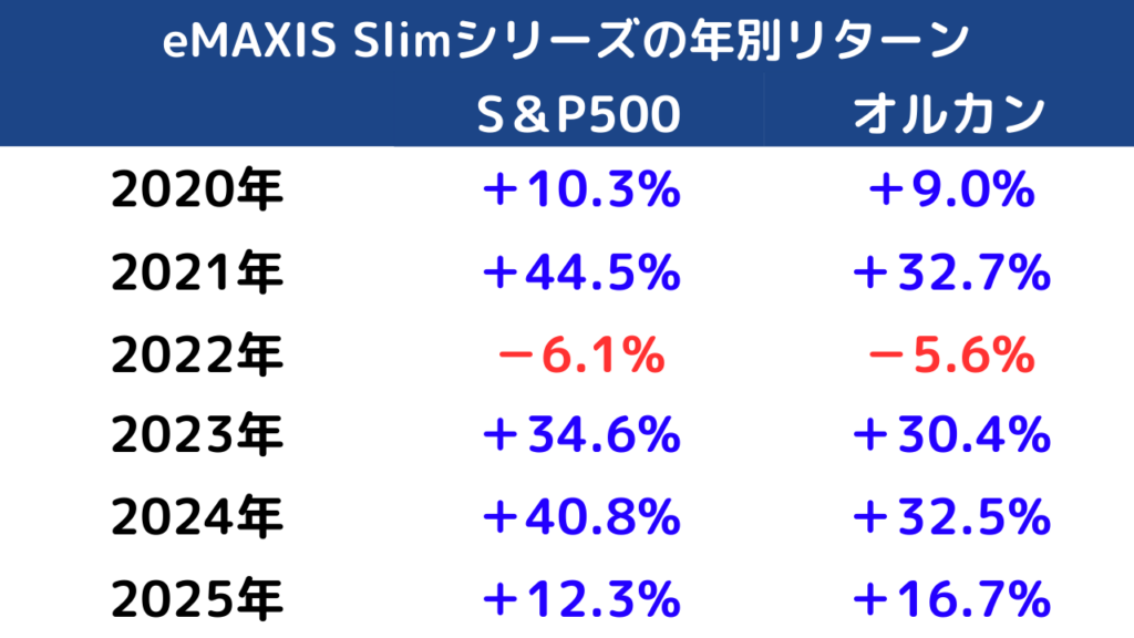 これは2020年からのeMAXIS SlimシリーズのS&P500とオルカンの年間のリターンをまとめたものです