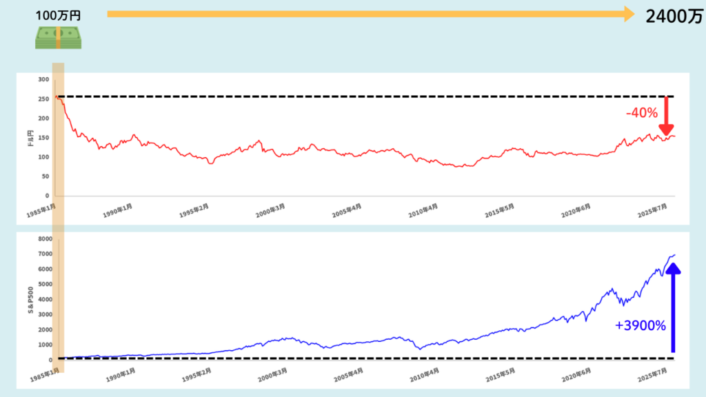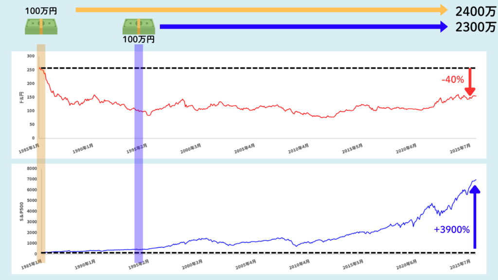 例えば1985年1月の超円安のときにS&P500に100万円投資していた場合、為替の影響では40%ほど資産額が目減りしますが、株式の成長が圧倒的なので最終的に約2400万円になっています