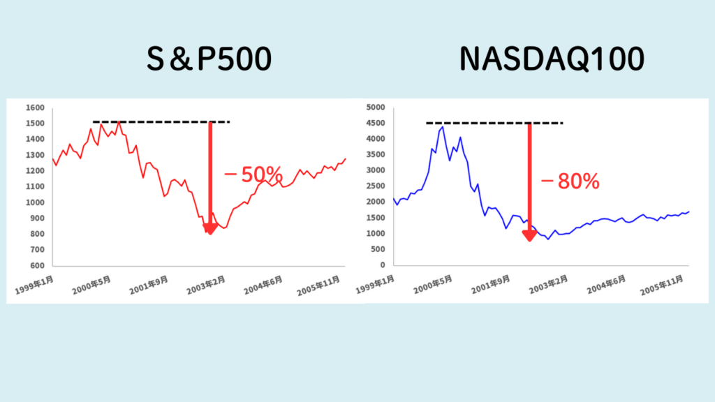 S&P500は最大で半分近くまで下がり、NASDAQ100に関してはなんと-80%という歴史的な大暴落となりました