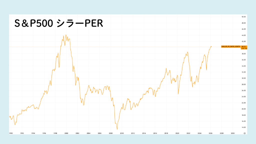 そしてドットコムバブル崩壊のときもこのPERがめちゃくちゃ高かったんですが、今がそれと同じくらい高い水準になっているんです