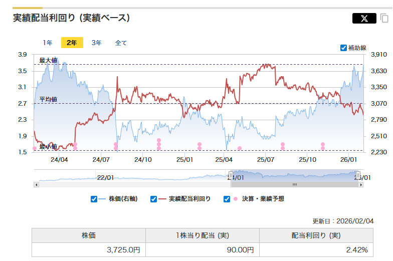 特に過去の利回りは、投資するかどうかの重要な判断要素になるんですけど、こんな感じでその推移を視覚的に見れる無料のサイトやツールって、私が知る限り銘柄スカウター以外ないので、高配当株とかなり相性がいいと思います