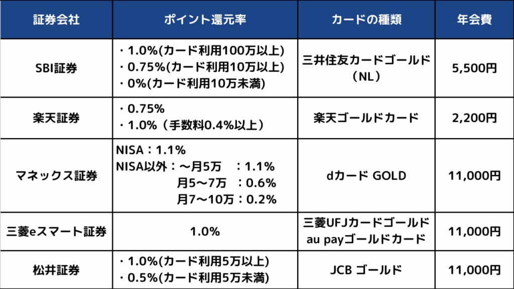 それぞれの証券会社で使えるカードの種類はいくつかあるんですが、今回は「一般カード」と「ゴールドカード」の2種類のカードで比較しました。