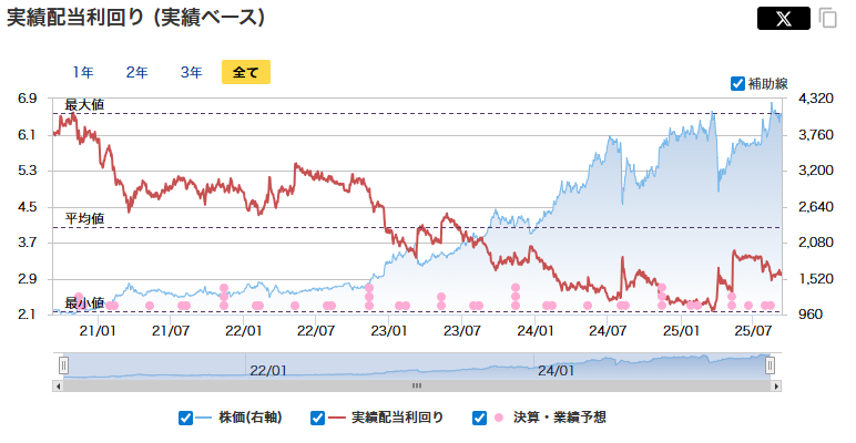 今はこの銘柄は買い時なのか?と悩む方も多いと思うんですが、銘柄スカウターを使えば、こんな感じで過去数年間の配当利回りの推移と、過去実績の平均値や最高値を一緒に示してくれます。